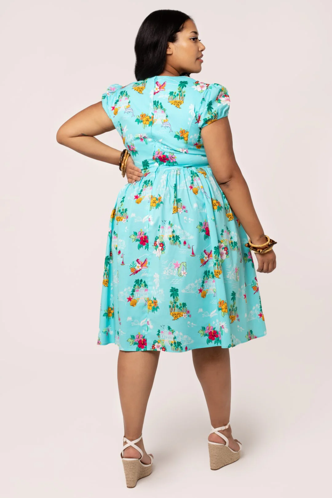 Faites un voyage paradisiaque avec la robe Ayanna. Cette robe en coton extensible de style années 50, arbore une base turquoise, illustrant des îles tropicales et la vie marine. Son décolleté en cœur est froncée sur le devant de la poitrine et rejoint des empiècements de style boléro aux épaules, complétés par des manches bouffantes. Les poches dans les coutures latérales rendent la robe Ayanna à la fois jolie et pratique, idéale pour toutes les occasions.