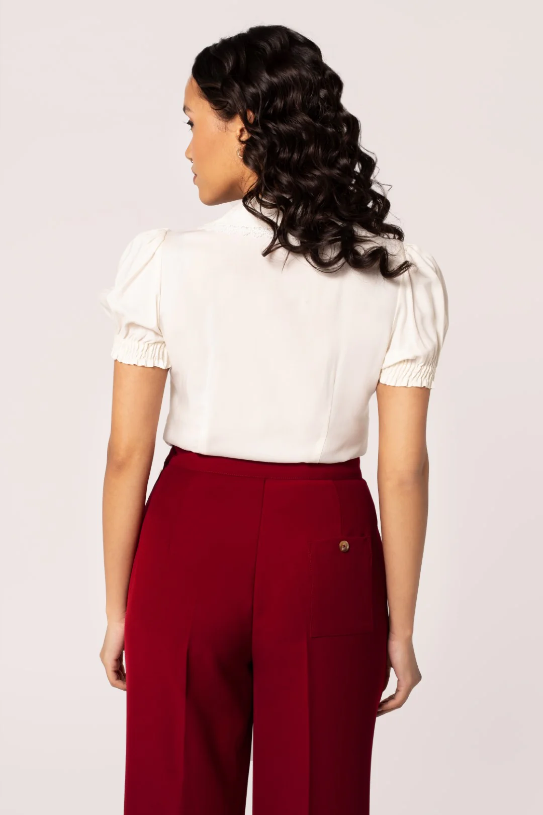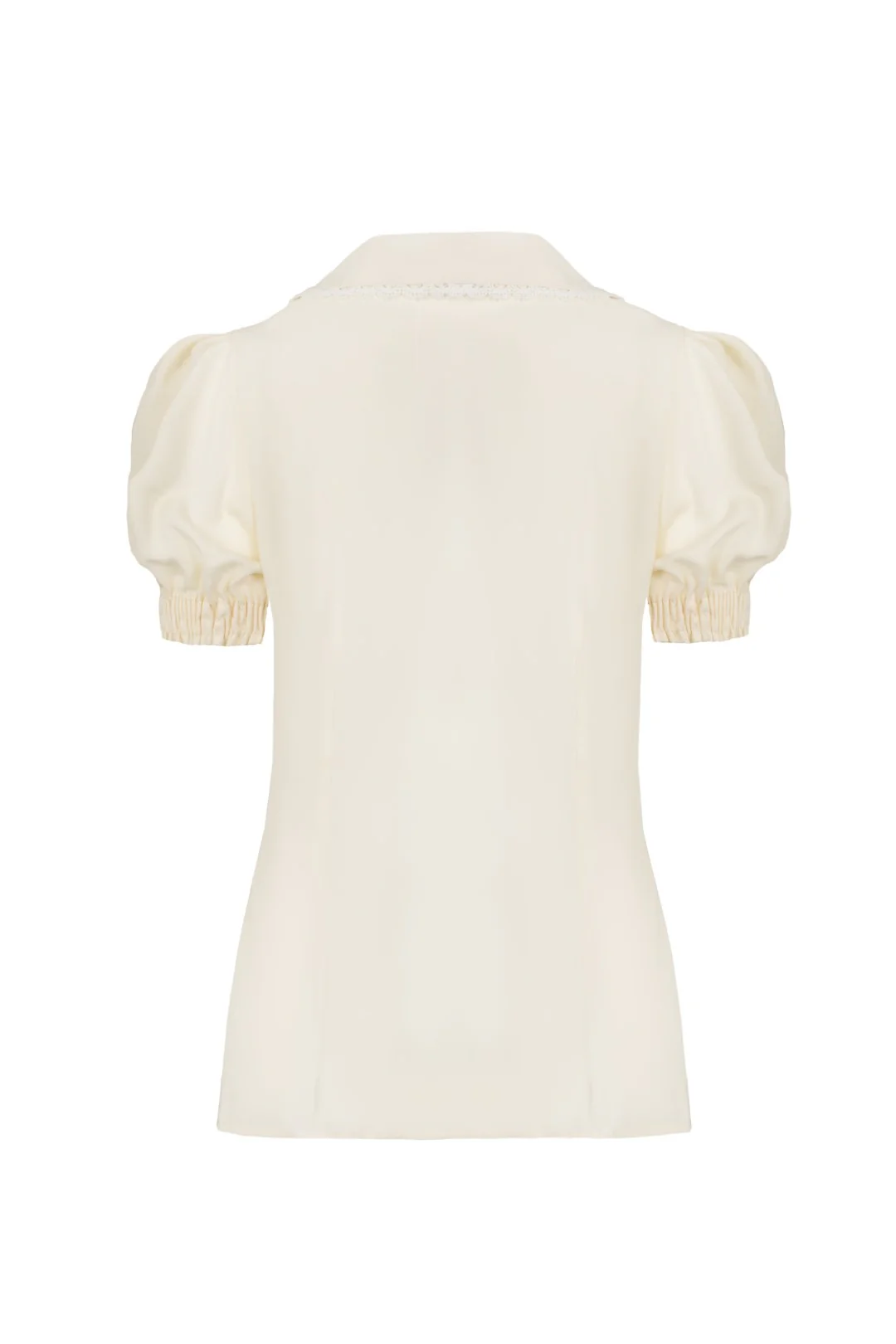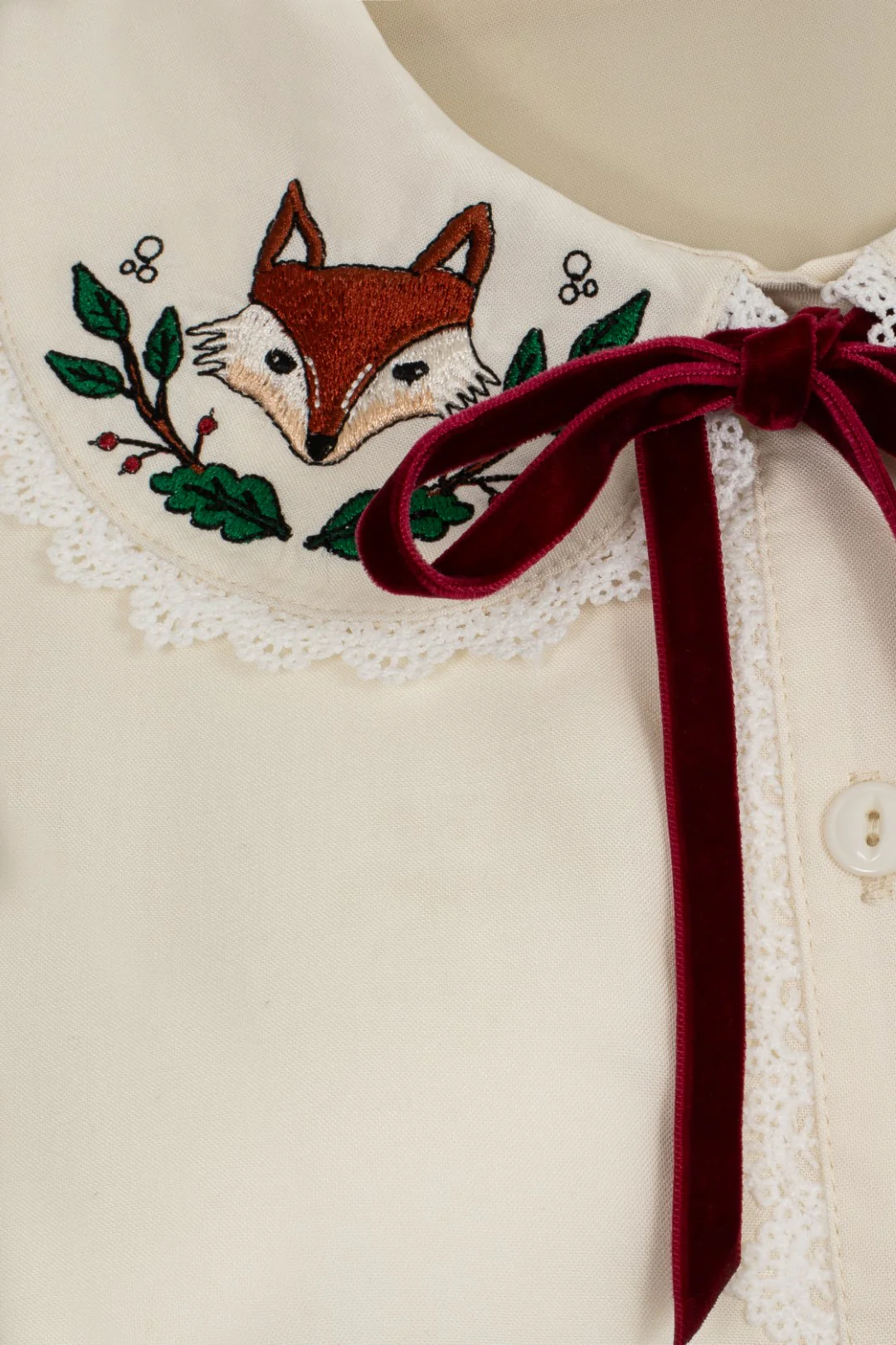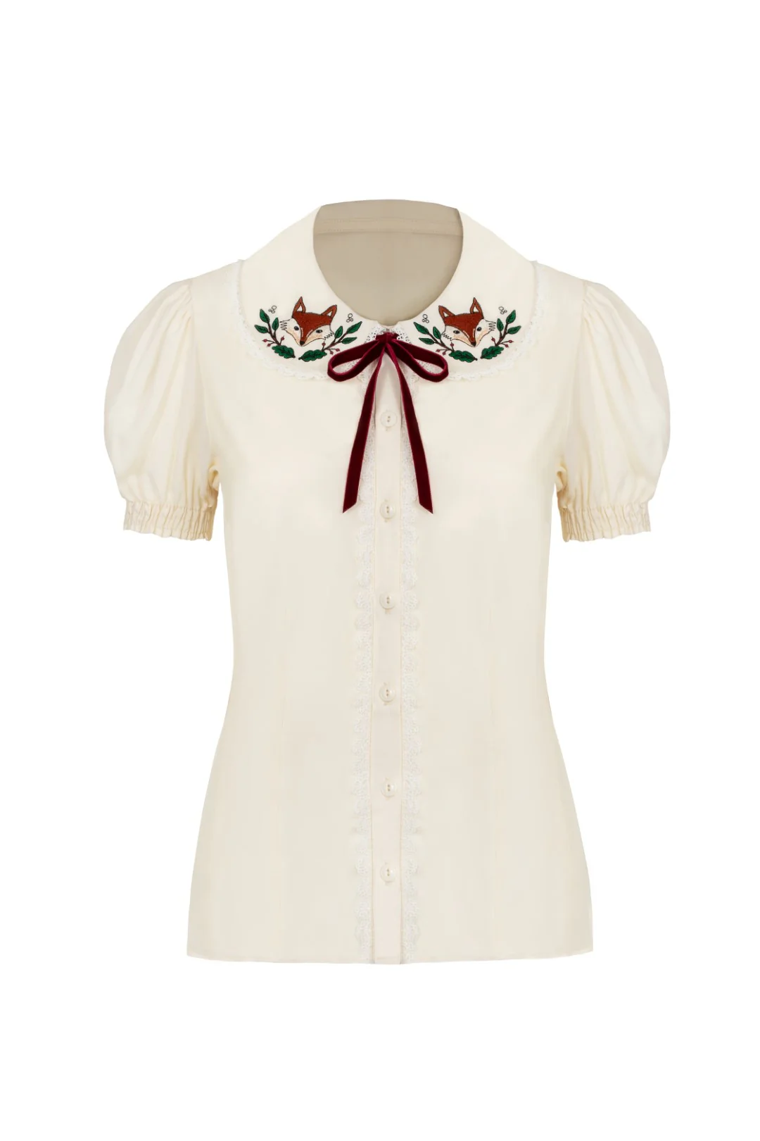 Ce chemisier ivoire au style rétro se distingue par son col Claudine brodé de renards et de feuillage, agrémenté d’un ruban bordeaux en velours. Avec ses manches courtes bouffantes et ses détails en dentelle, il apporte une touche chic, originale et pleine de charme.