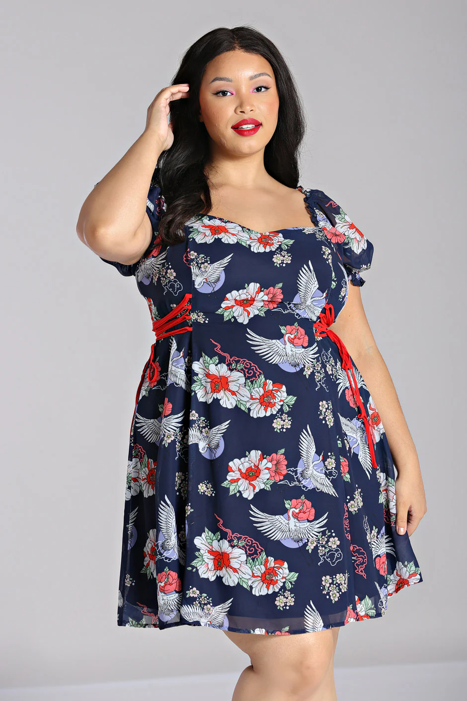Mini robe imprimée, Base bleu marine avec grands motifs floraux et grues volantes rouges, roses et blanches.