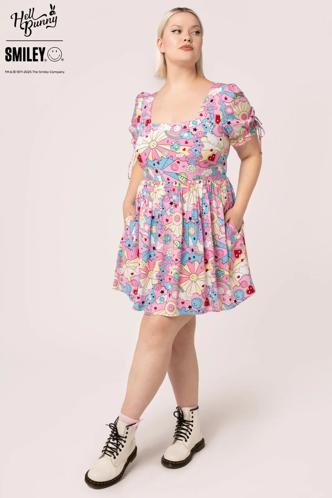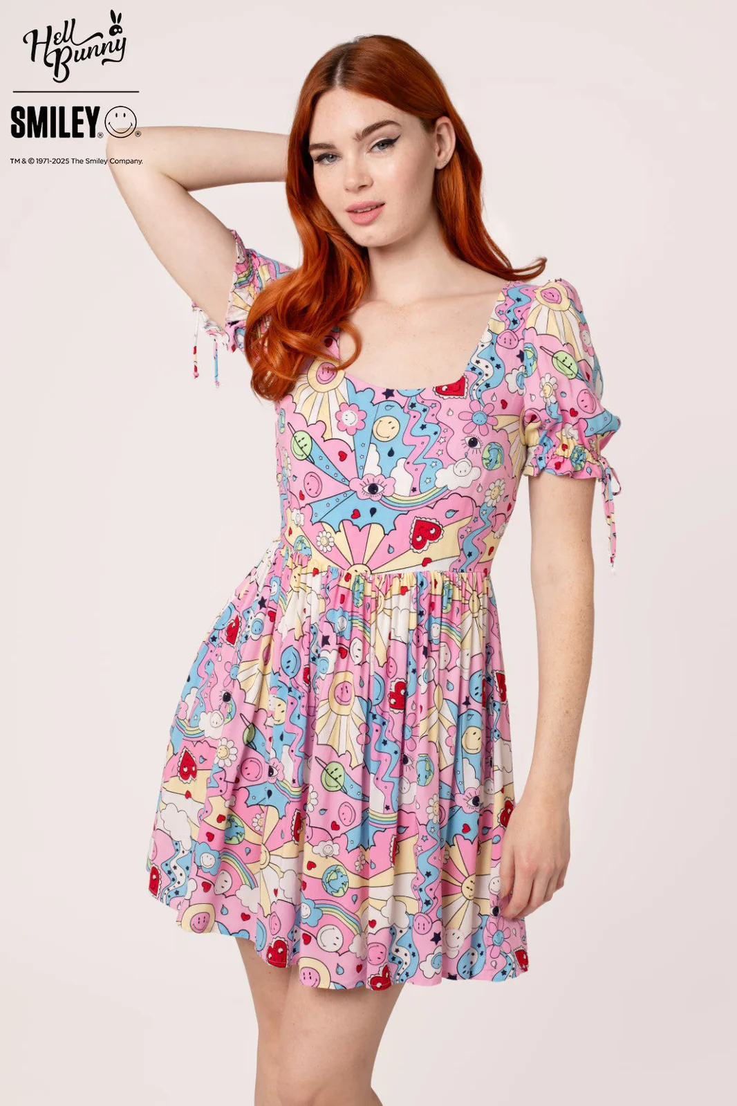 Née de la collaboration entre Hell Bunny et Smiley® Originals, la robe Loulou est un modèle adorable ! Cette mini-robe arbore un décolleté carré devant et derrière, de délicates manches bouffantes avec poignets et liens élastiques à volants, ainsi qu’un corsage ajusté qui se prolonge par une jupe volumineuse à fronces. Cette robe est confectionnée dans un doux rose, orné de cœurs, d’étoiles, de planètes et d’arcs-en-ciel Smiley®. À noter : des liens réglables au dos forment un adorable nœud. Que vous soyez habillée ou décontractée, la robe Loulou illuminera votre journée !